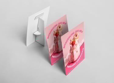 Widely used in point-of-sale marketing, Strut cards are a brilliant way to bring attention to a special promotion. Our strut cards are printed on 450gsm silk, affixed to a rigid box-board strut and supplied ready to go. Include a lamination for increased longevity.